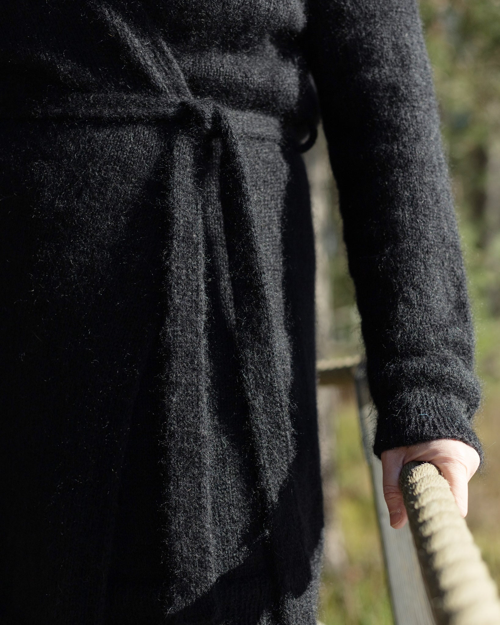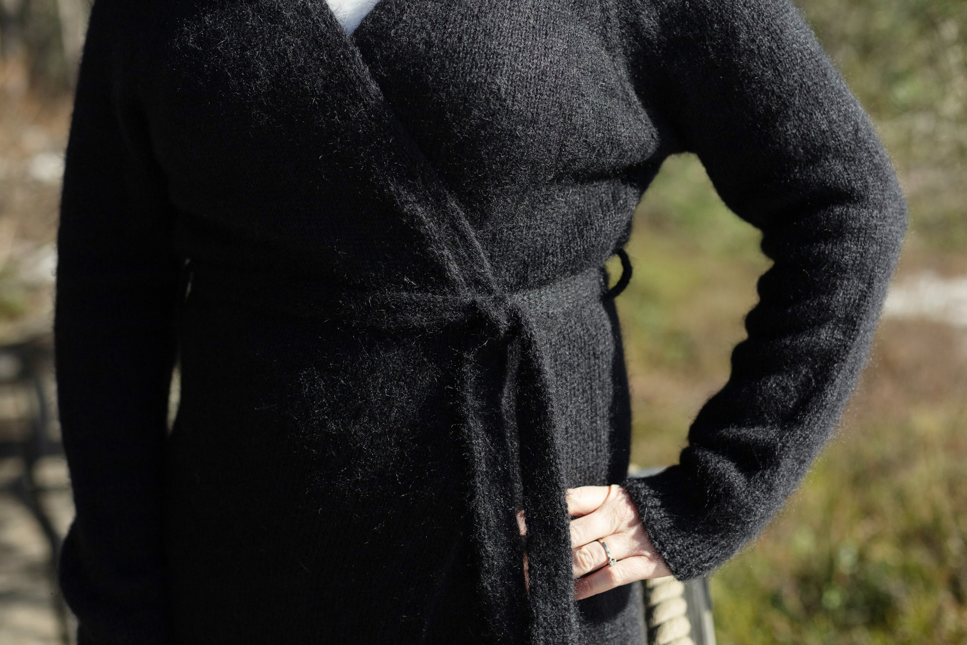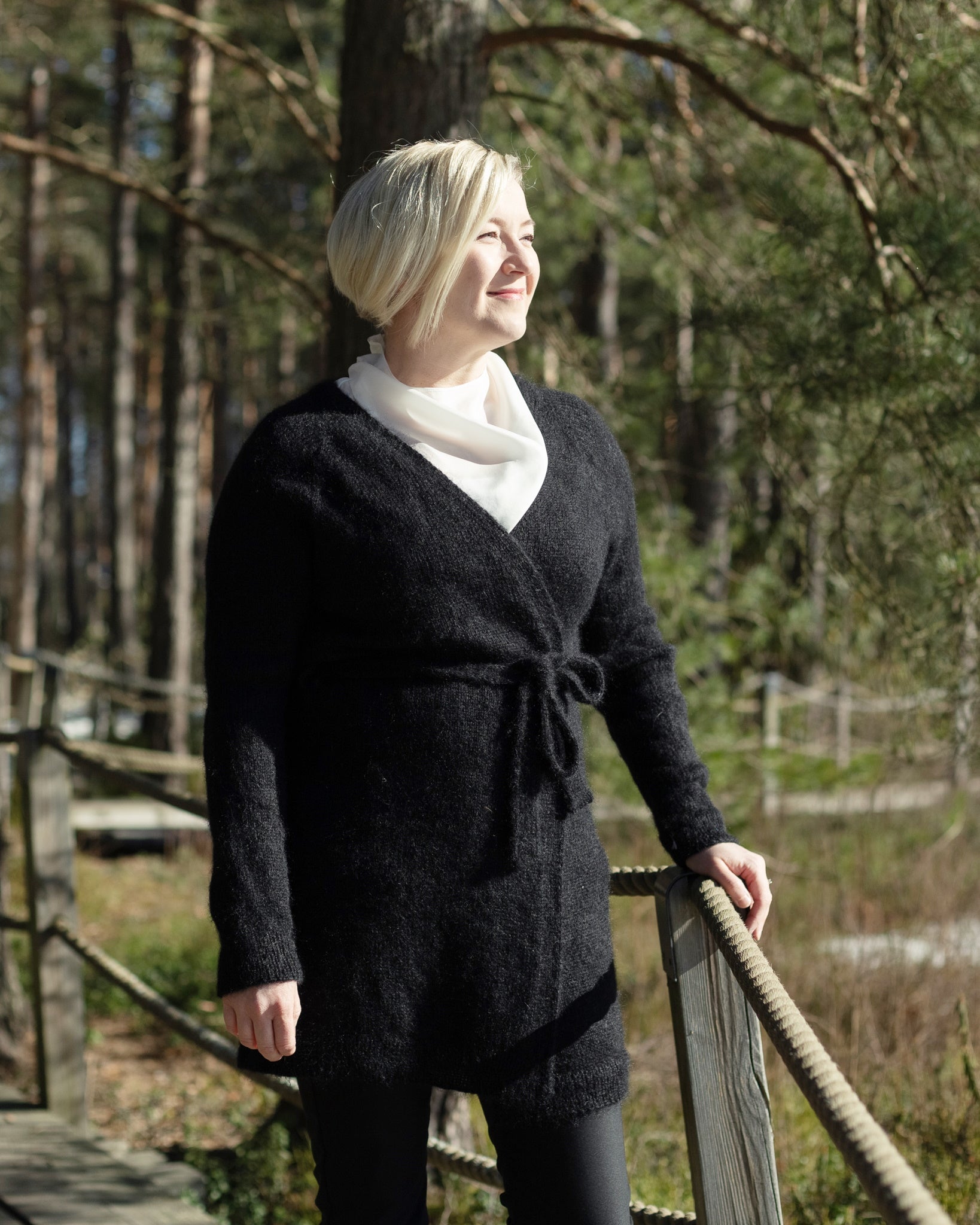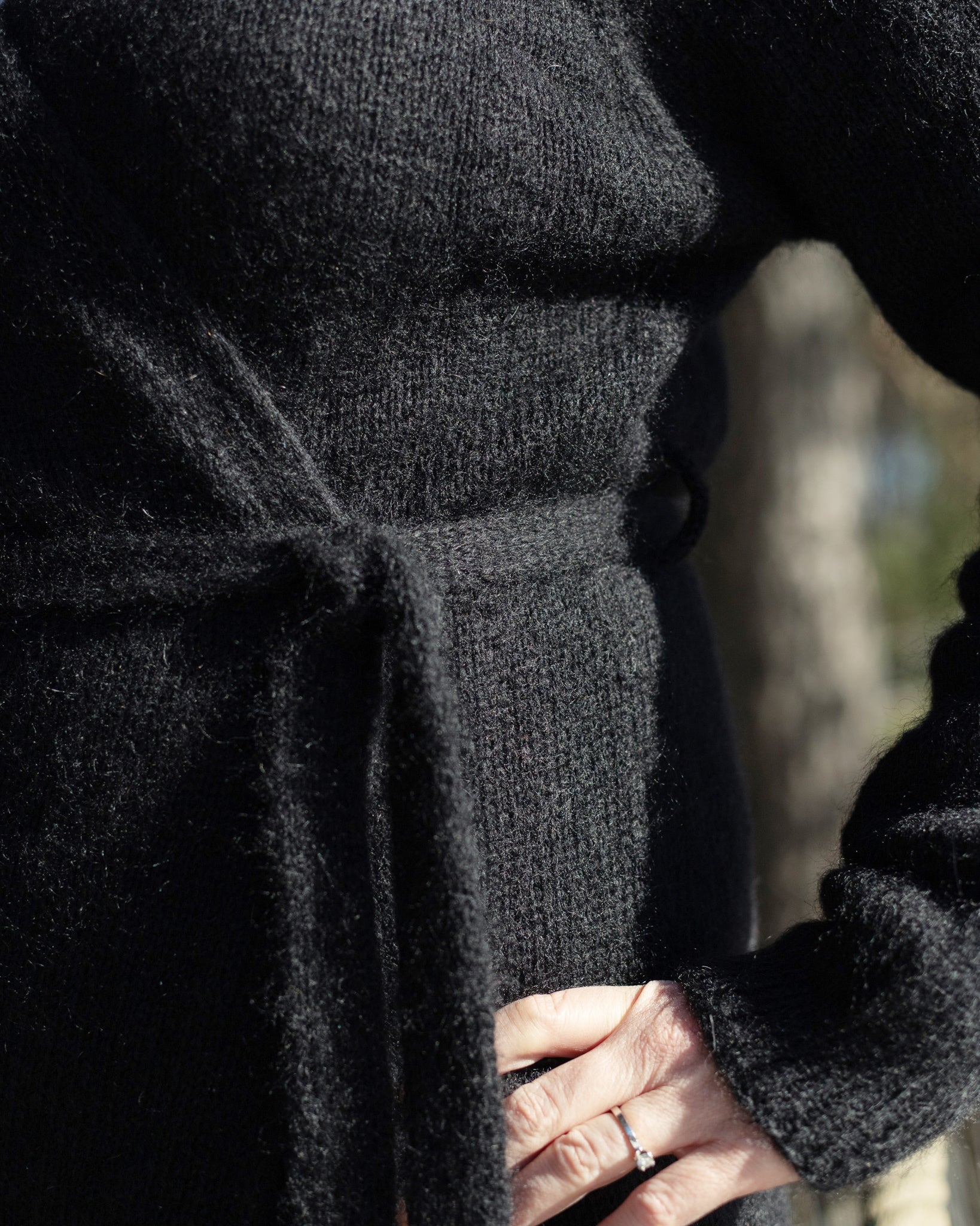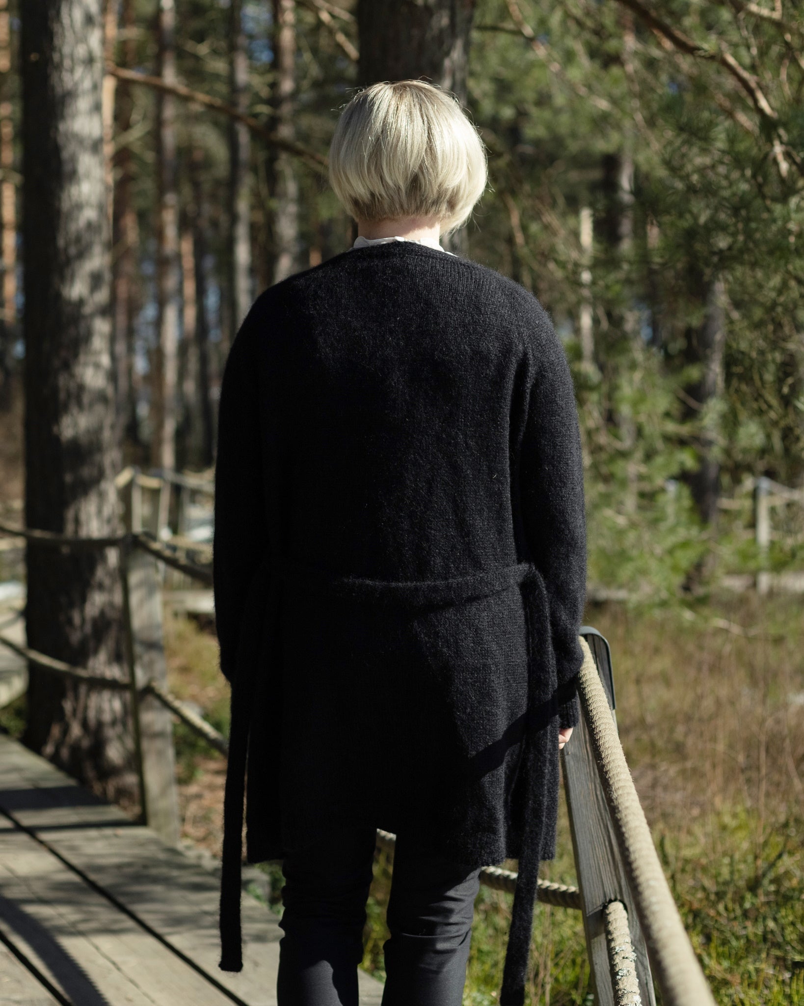 This cardigan is very simple raglan sleeved cardigan that is worked from the top-down. It has very subtle a-line shaping on body and fronts overlapping with v-neck shape. Belt closes the cardigan, but it can be worn as fronts open, too.